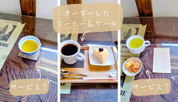 最初にお茶が運ばれてきて、そのあと注文したコーヒーとケーキが運ばれてきます。そして最後にお茶(レモネード)とお菓子が運ばれてきます。