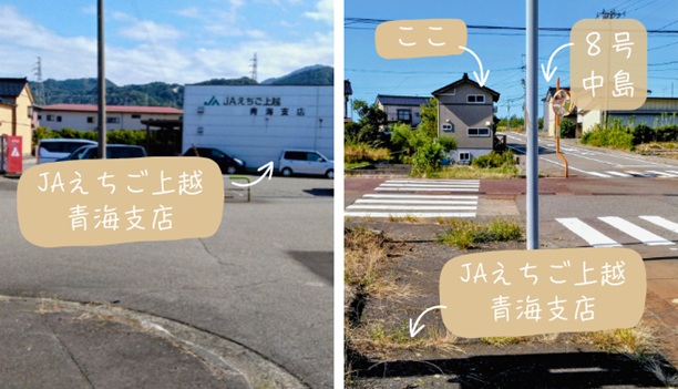 糸魚川市にある国道8号線の「中島」から曲がってください。「JA えちご上越 青海支店」が見えると思いますが、そこにたどり付く前にあります。